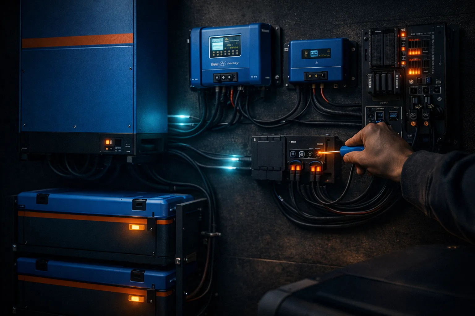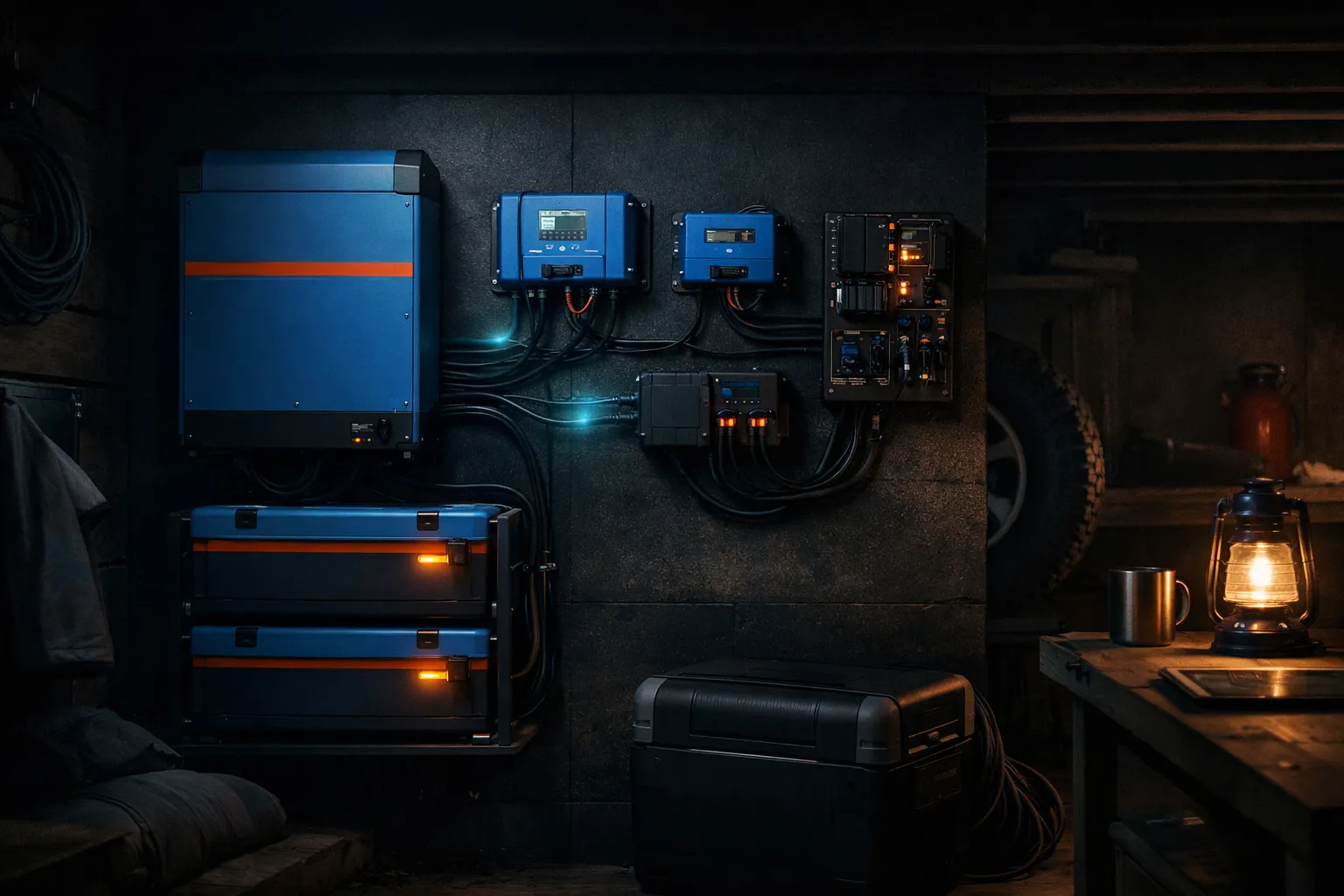 A Victron off-grid system at 48V often includes a solar array, a larger battery bank, inverter output for household circuits, and backup generator support. The main planning question is resilience through low-solar periods.