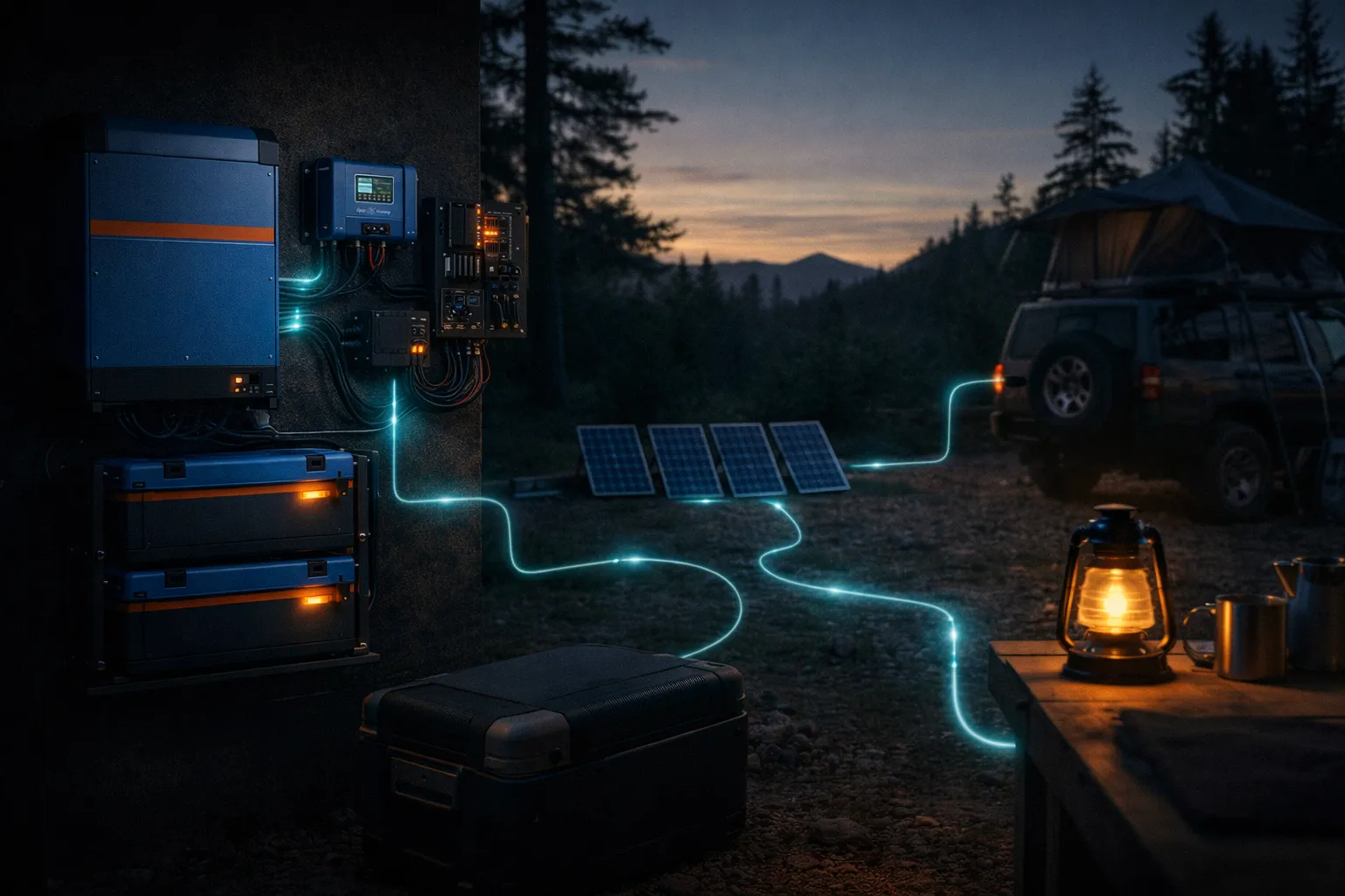 A common Victron camper setup combines rooftop solar, alternator charging while driving, shore power when connected, lithium battery storage, and inverter-charger support for AC loads. The modeling challenge is balancing charge priority and reserve retention while avoiding campsite overload.